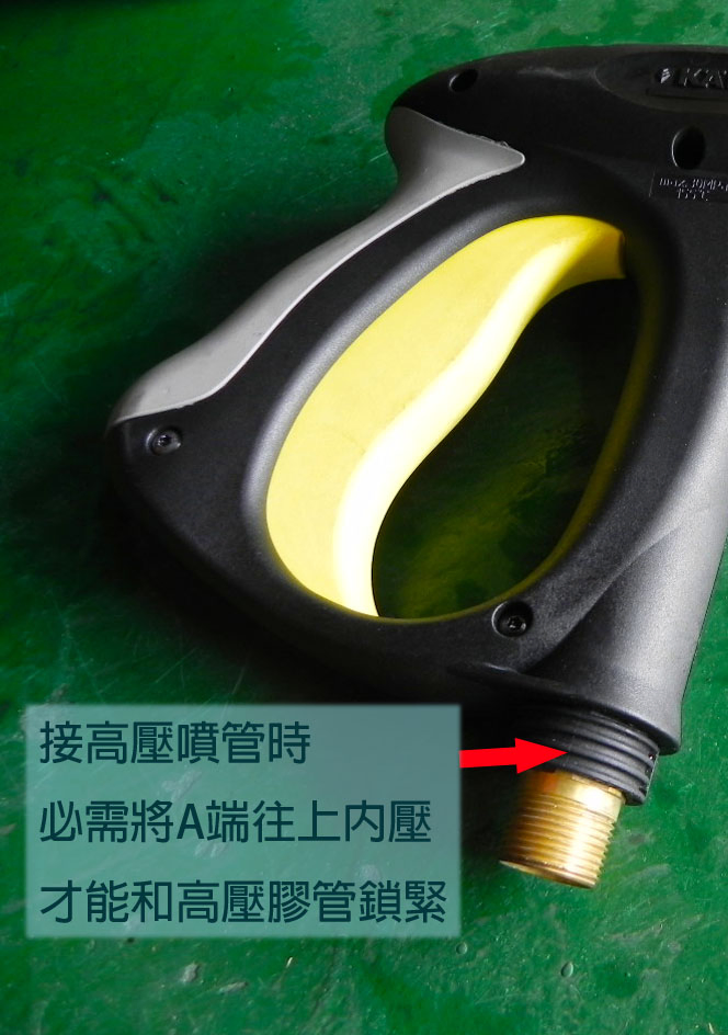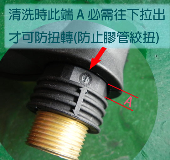 高壓清洗機之噴槍使用說明 高壓清洗機之噴槍使用說明 1.清洗時此端A必需往下拉出才可 2.白色壓力調整圓筒時,往-方向旋轉則降壓,往+方向旋轉則升壓. 3.噴槍A接頭軸,注意對準卡榫A端往上內塞 ※螺接高壓噴管(固定不轉)狀態 ※接高壓噴管時必需將A端往上內壓塞才能固定不轉,方能和高壓膠管螺緊 。